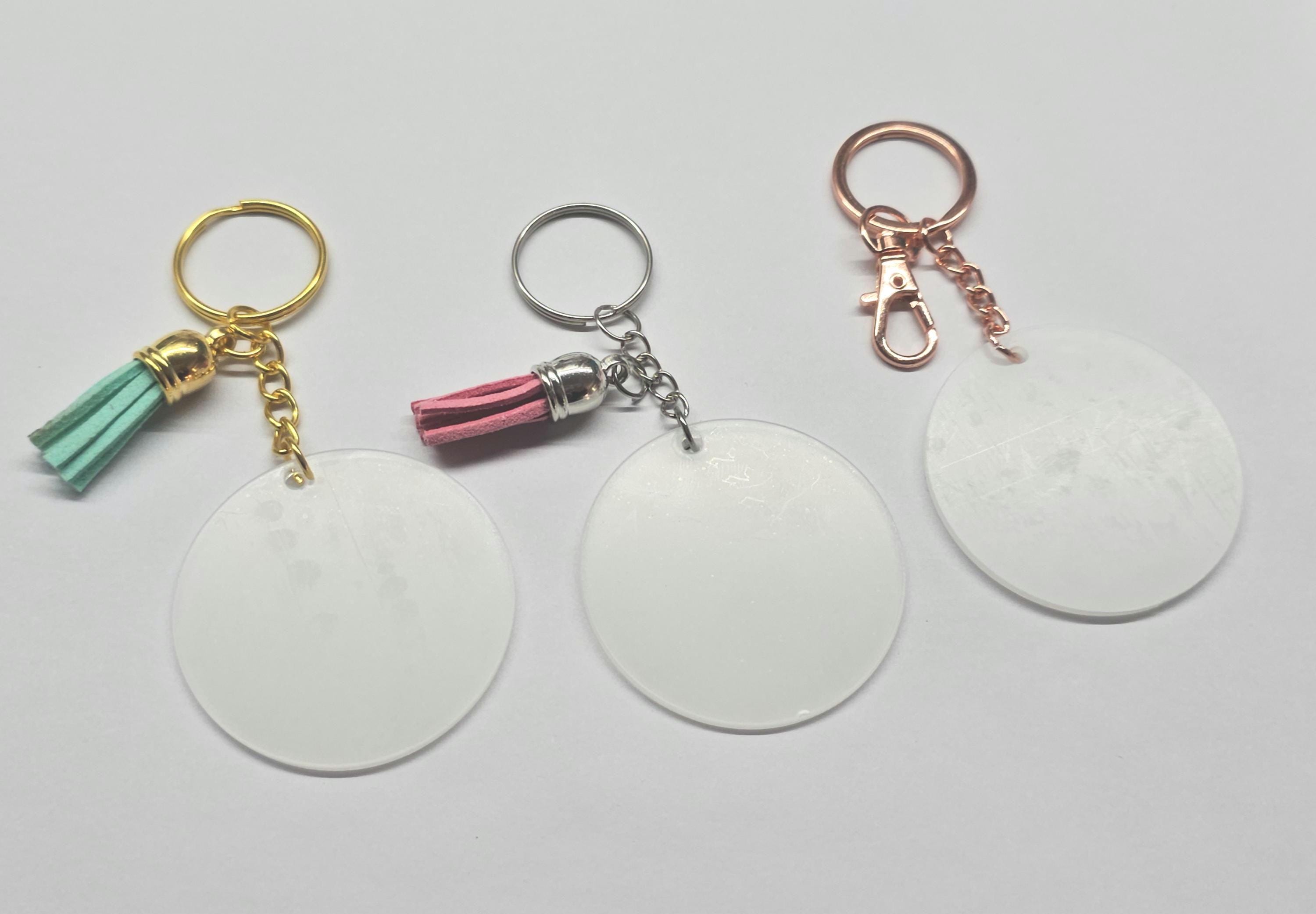 2" inch round acrylic keychain. Paint brush vinyl stroke design on back personalized with name on front. Each Keychain will come with matching tassel.