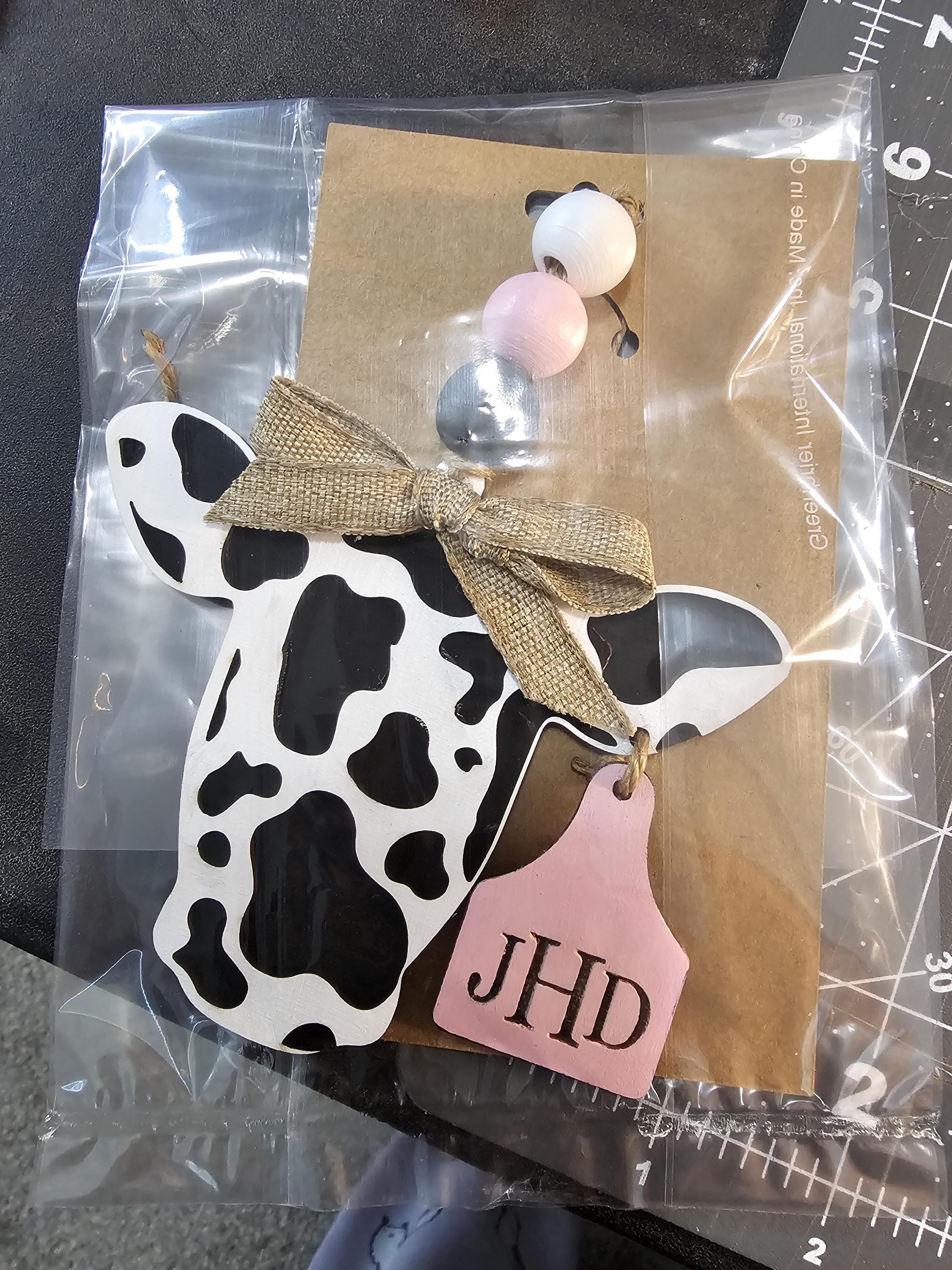 This Cow is double layered. Each charm is secured with twine and adorned with three beads. The tag can be personalized or left blank. Charm is made of birch wood. Perfect addition to your new car!